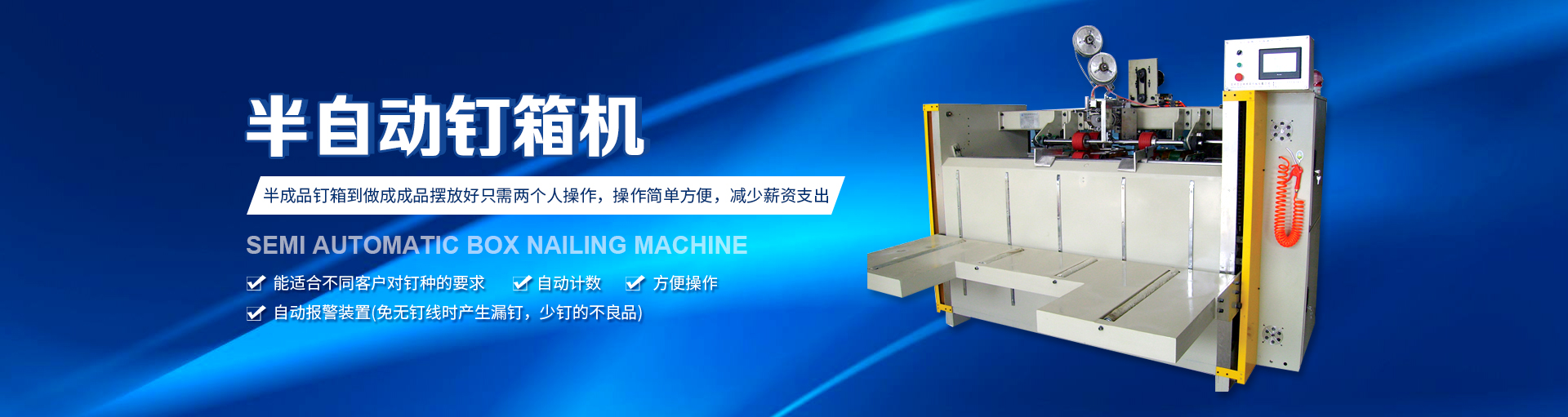 半自動(dòng)釘箱機(jī)設(shè)備特點(diǎn)釘箱機(jī)在現(xiàn)在的機(jī)械行業(yè)內(nèi)使用比較的廣泛,因?yàn)楝F(xiàn)在紙箱包裝機(jī)械的發(fā)展迅速,企業(yè)關(guān)于釘箱機(jī)的要求也越來(lái)越高,而組織制造業(yè)想要使設(shè)備更具競(jìng)爭(zhēng)力,需要關(guān)于半自動(dòng)釘箱機(jī)的...查看詳情+